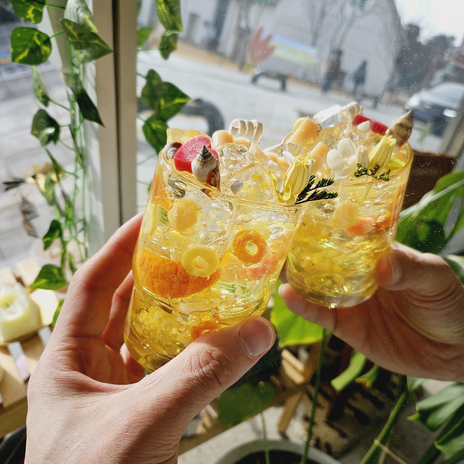 우리가 자주 마시는 음료를 닮아 투명하고 시원한 느낌의 에이드 캔들은 젤 왁스라는 캔들재료를 메인으로 사용하여 작업되는 캔들이에요. 투명한 재료이기 때문에 색소를 넣어도 기본적으로 투명한 느낌이 들고 청량한 느낌을 준답니다. 내부를 꾸며주는 다양한 재료들을 이용하여 디자인을 하게 되는데 사용하는 재료에 따라 다양한 컨셉으로 작업이 가능합니다. [꽃, 식재료 모양의 왁스,바다 재료] 등으로 다양한 컨셉으로 디자인을 할 수 있는 재미난 체험입니다.