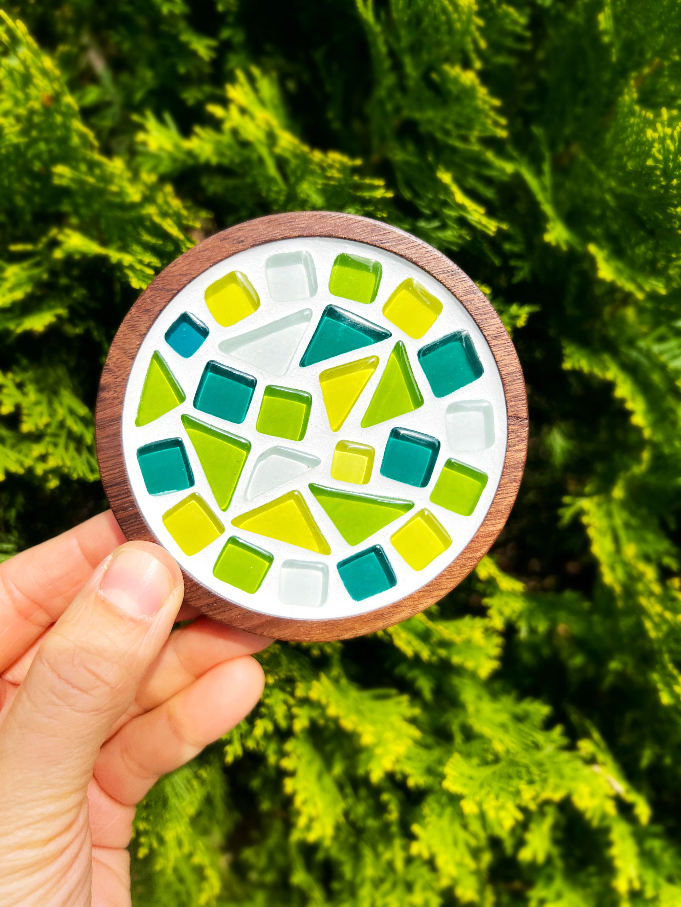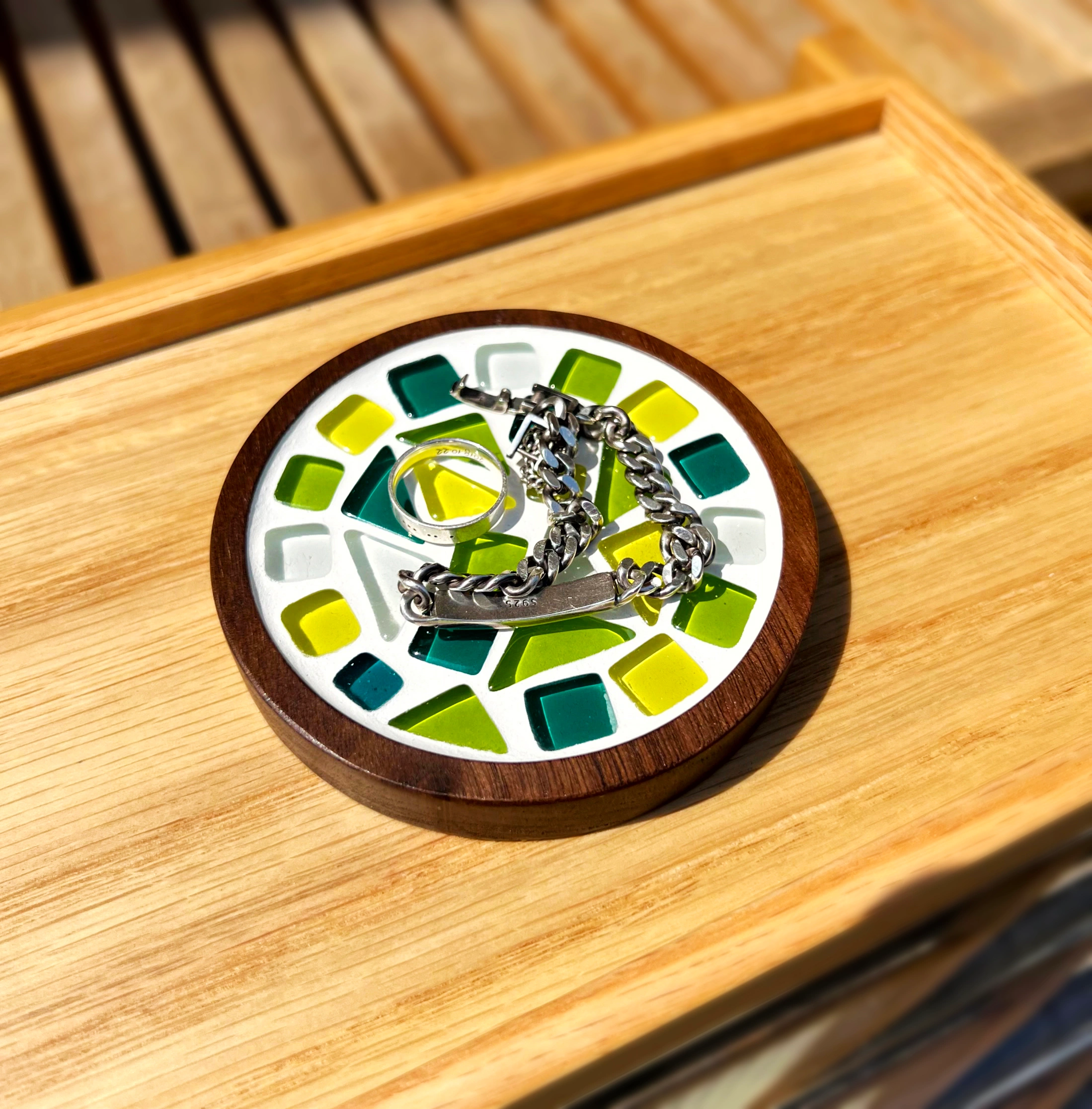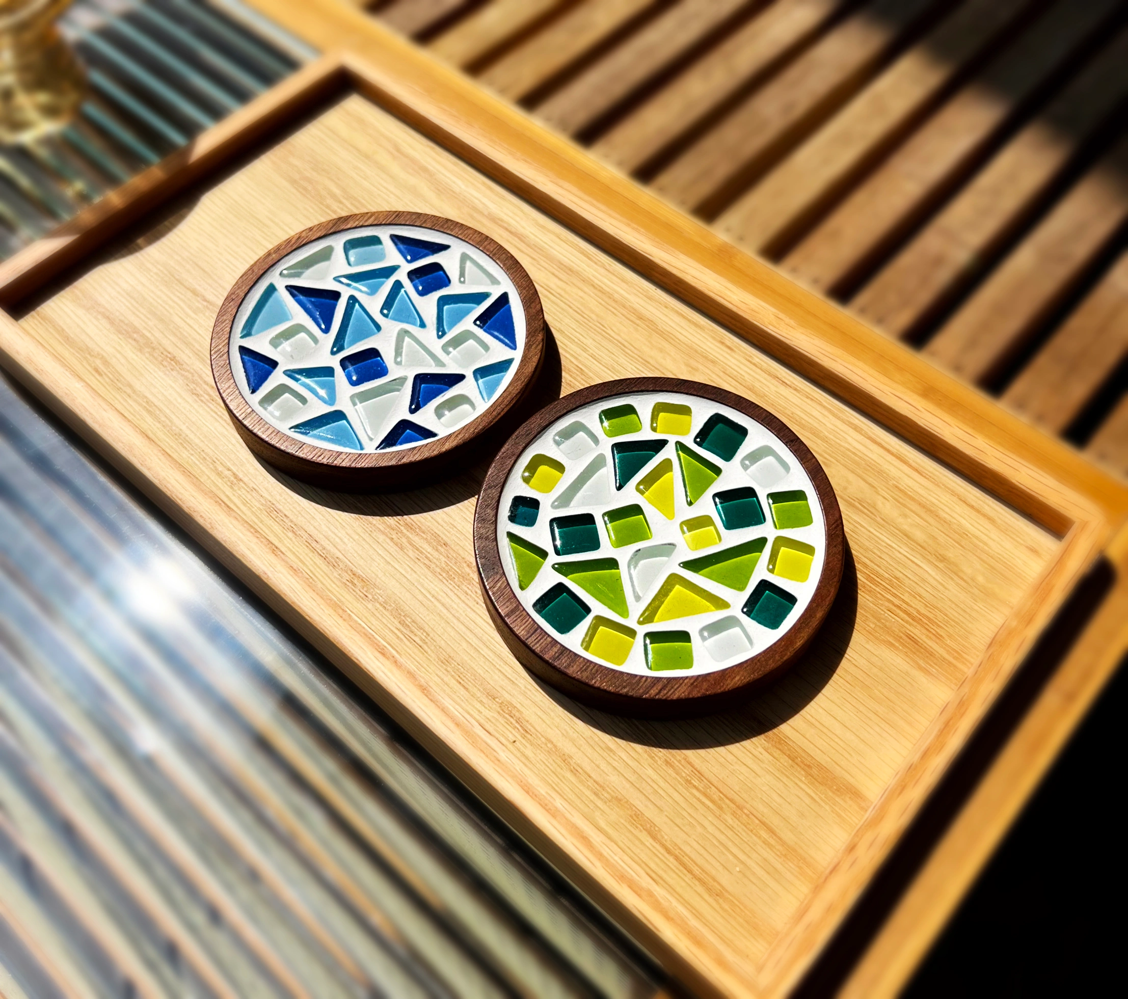 나무 판위에 유리타일 배열 디자인